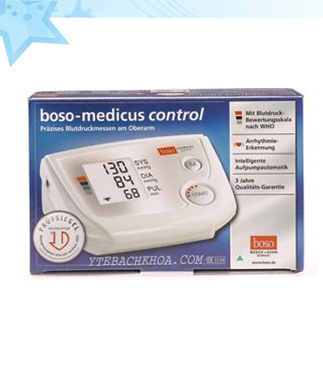 Máy đo huyết áp Boso Medicus Control là máy đo huyết áp bắp tay tự động, phương pháp đo dao động kế chuyền dẫn đến bộ vi xử lý. Boso Medicus Control là dòng sản phẩm uy tín và phù hợp theo qui định của Châu Âu áp dụng cho thiết bị y tế (CE) cũng như tiêu chuẩn Châu Âu EN 1060. Sản phẩm được hiệp hội tiêu dùng Đức chứng nhận năm 2008.