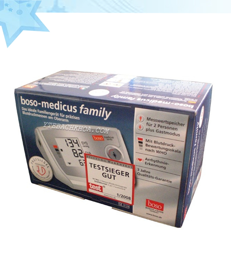 Máy đo huyết áp Boso Medicus Family là máy đo huyết áp bắp tay tự động, phương pháp đo dao động kế chuyền dẫn đến bộ vi xử lý. Boso Medicus Family là dòng sản phẩm uy tín và phù hợp theo qui định của Châu Âu áp dụng cho thiết bị y tế (CE) cũng như tiêu chuẩn Châu Âu EN 1060. Sản phẩm được hiệp hội tiêu dùng Đức chứng nhận năm 2008 và Hiệp hội tim mạch Châu Âu chứng nhận và khuyên dùng.