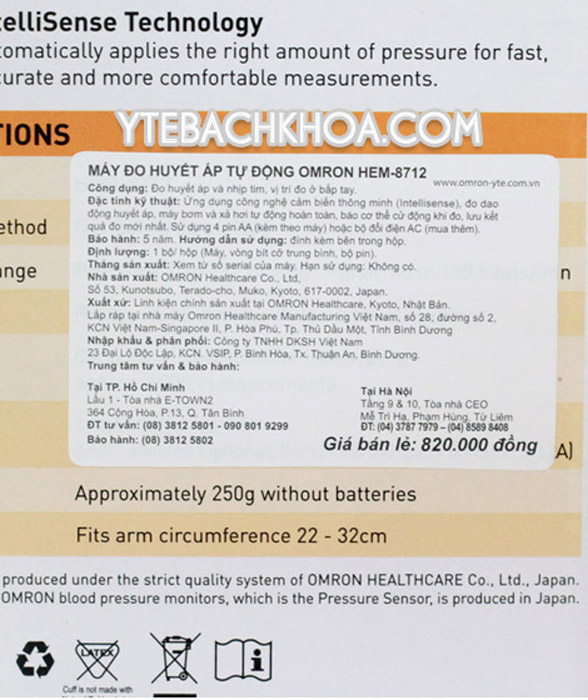 - Xuất xứ: LINH KIỆN CHÍNH SẢN XUẤT TẠI OMRON HEALTHCARE, KYOTO, NHẬT BẢN, LẮP RÁP TẠI NHÀ MÁY OMRON BÌNH DƯƠNG, VIỆT NAM