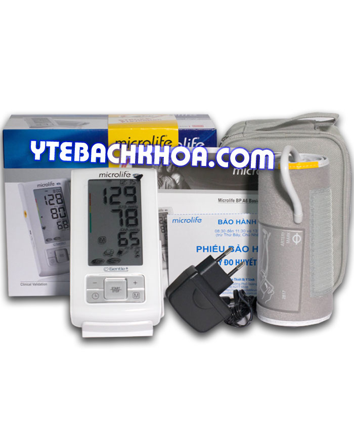 - Máy đo huyết áp bắp tay Microlife BP A6 Basic là thiết bị đo huyết áp thế hệ mới của Microlife được tích hợp công nghệ đo Gentle+, AFIB và MAM giúp đưa ra kết quả chính xác và tin cậy, cảnh báo sớm về chứng Tăng huyết áp và Rung nhĩ, hai nguyên nhân chính dẫn đến Đột quỵ não.