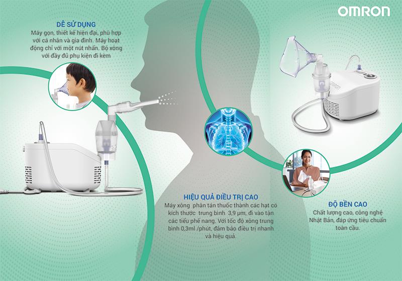 Máy xông mũi họng Omron NE-C101 hỗ trợ điều trị các bệnh về đường hô hấp như viêm xoang, hen suyễn, tắc nghẽn phổi....